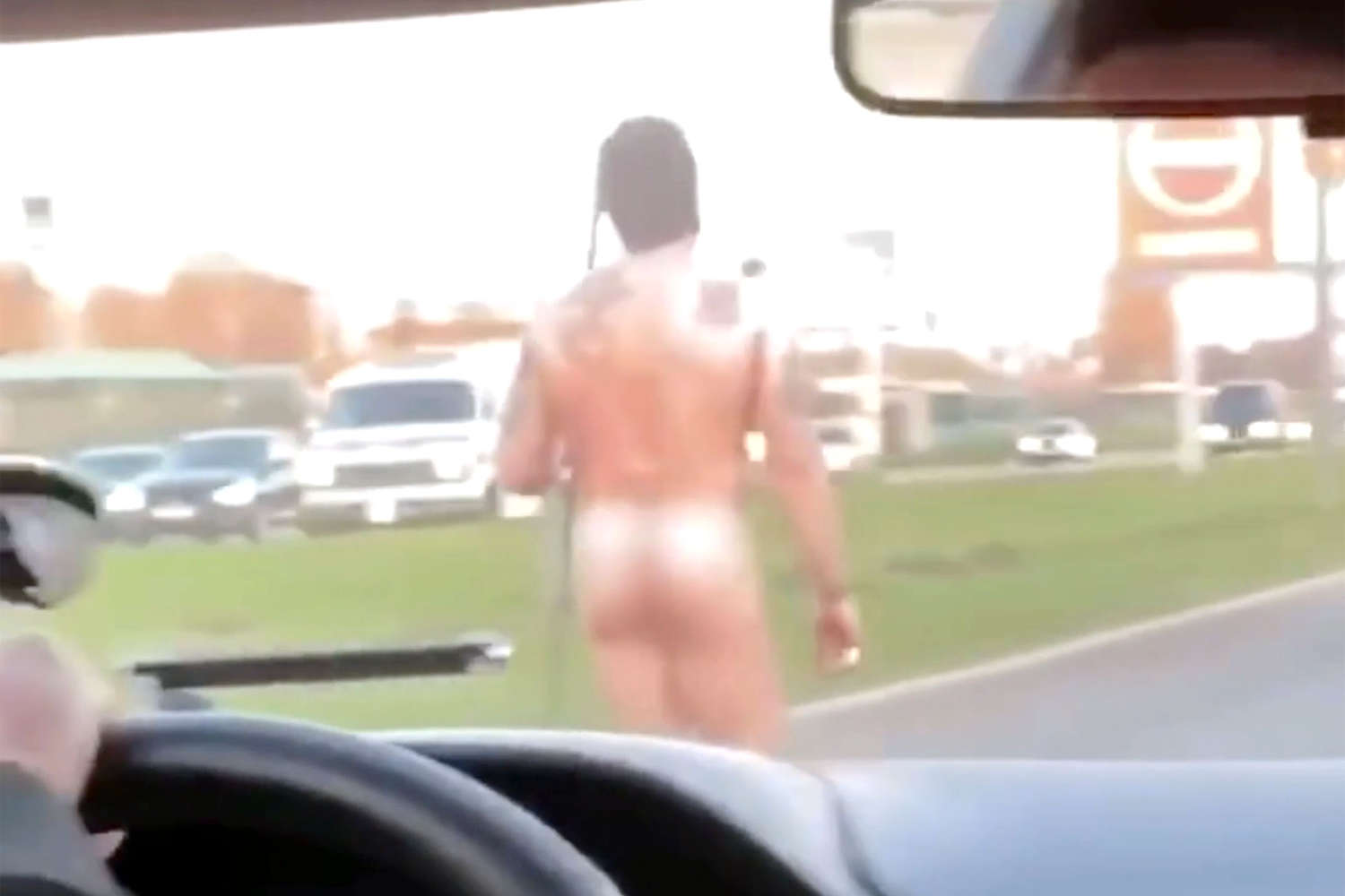 Автомобилисты засняли голого татуированного мужчину с багром, идущего по Витебскому проспекту Санкт-Петербурга. Видео опубликовали в социальной сети «ВКонтакте» в группе «ДТП и ЧП Санкт-Петербурга».