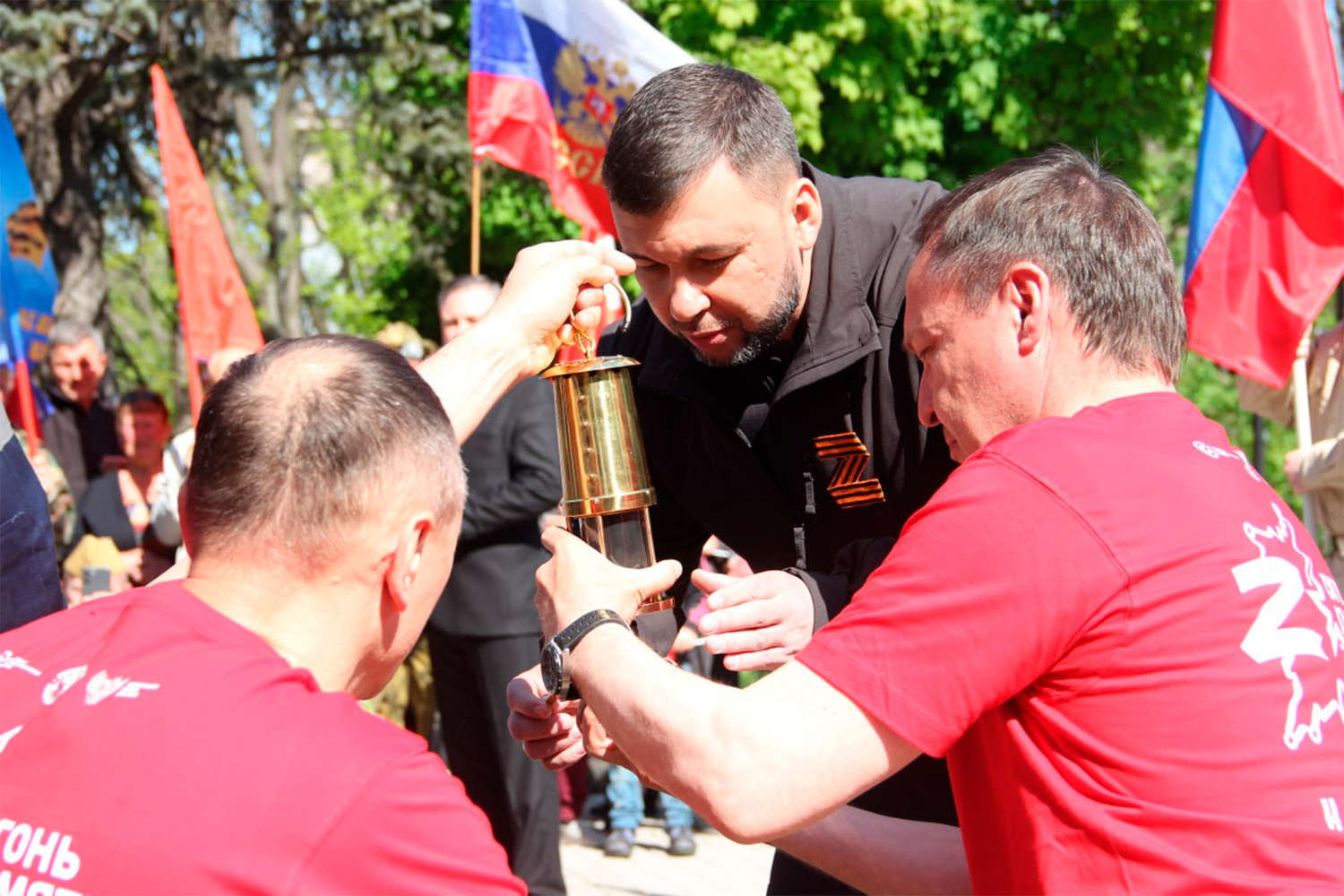 Отмечается, что частицы Вечного огня в освобожденный город доставили от стен Кремля. Пушилин передал лампаду с этим символом памяти о Великой Победе ветерану Великой Отечественной войны Тамаре Федченко.