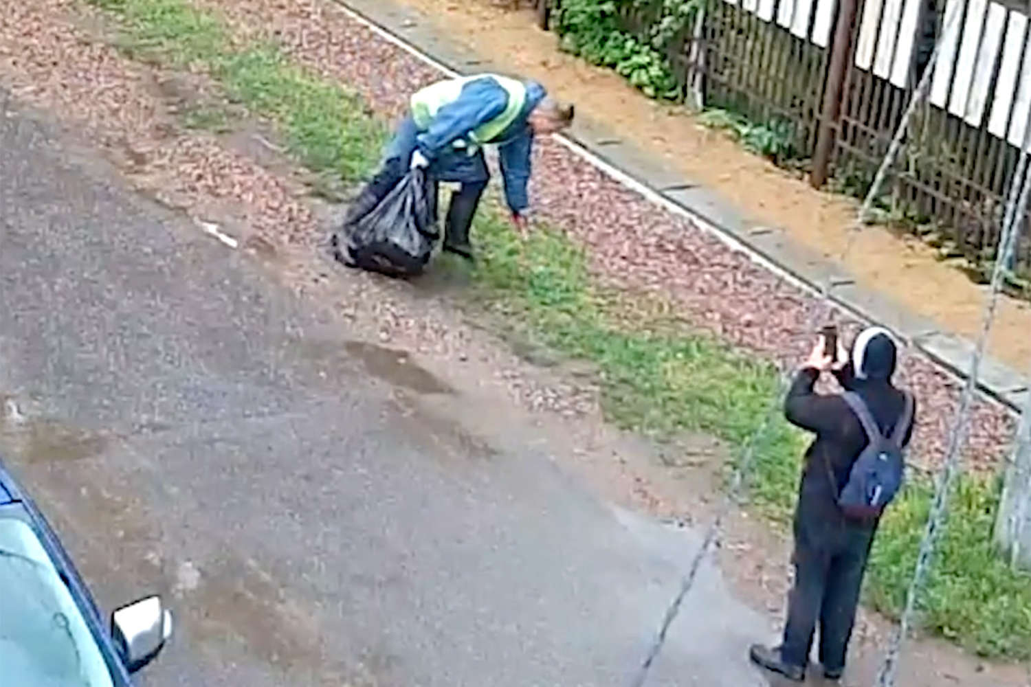 На записи с камер скрытого наблюдения видно, как мужчина достает из черного пакета для мусора бумажку, бросает ее на землю, а через какое-то время подбирает ее и кладет обратно. Момент подбора фотографирует на мобильный телефон его товарищ. Молодые люди повторяют действия на разных участках дороги. Вероятнее всего, эти фотографии нужны для отчета о проделанной работе.