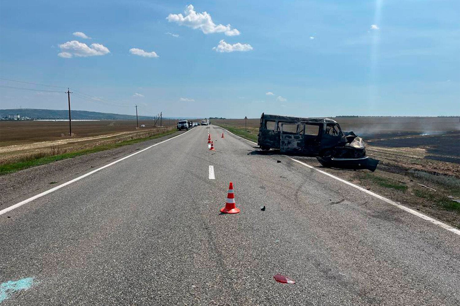 В результате лобового столкновения оба автомобиля загорелись, микроавтобус перевернулся.
