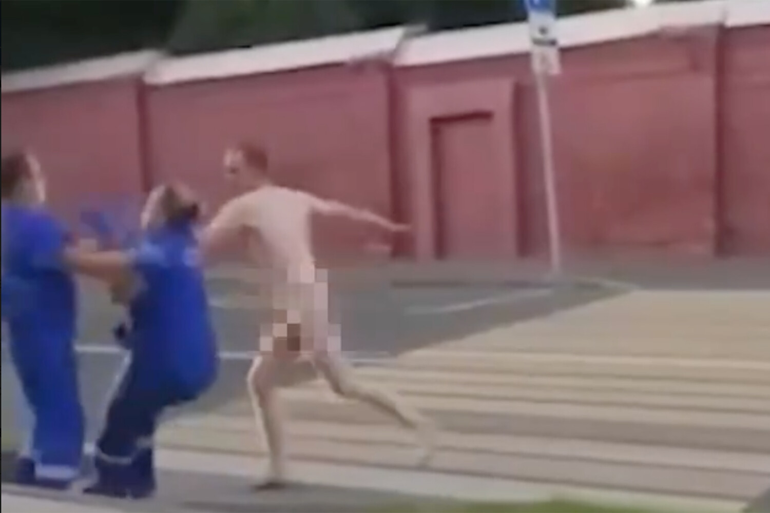 На ролике видно, как обнаженный мужчина средних лет прогуливается неподалеку от проезжей части. Рядом с россиянином находились две женщины-фельдшера, которые прибыли, чтобы оказать ему помощь и отвезти в больницу.