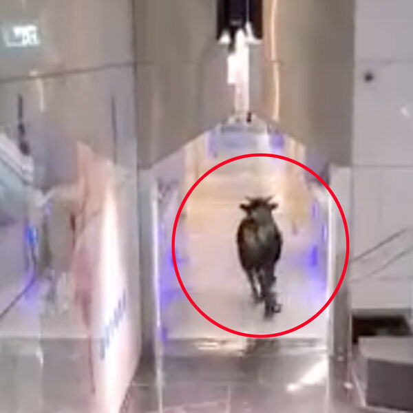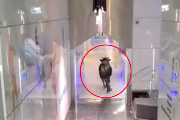 На распространенных кадрах видно, как бык пробежал по коридору финансового учреждения, распугав сотрудников и посетителей.