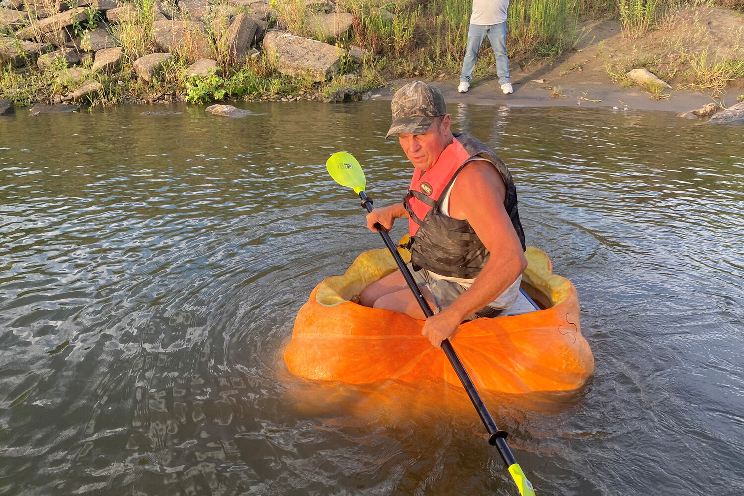 Как пишет The Guardian, мужчина из Небраски (США) установил новый мировой рекорд, проплыв 38 миль (более 61 км) по реке в огромной тыкве, из которой предварительно была удалена мякоть и плод стал своеобразной круглой лодкой.