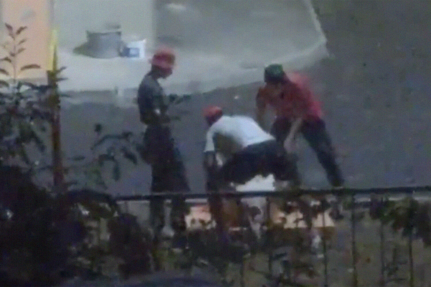 На видео видно, как трое мужчин прокалывают животному живот. Свидетели случившегося рассказали, что после убийства барана подвесили на турники спортплощадки и освежевали.