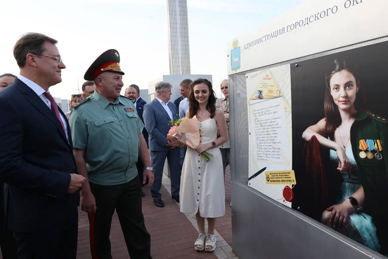 На площади Славы в Самаре открылась уникальная фотовыставка «Жены героев», посвященная женщинам, чьи супруги посвятили свою жизнь защите Родины. Вместе с женами военнослужащих, военными, ветеранами и активистами выставку открыл губернатор Самарской области Дмитрий Азаров.