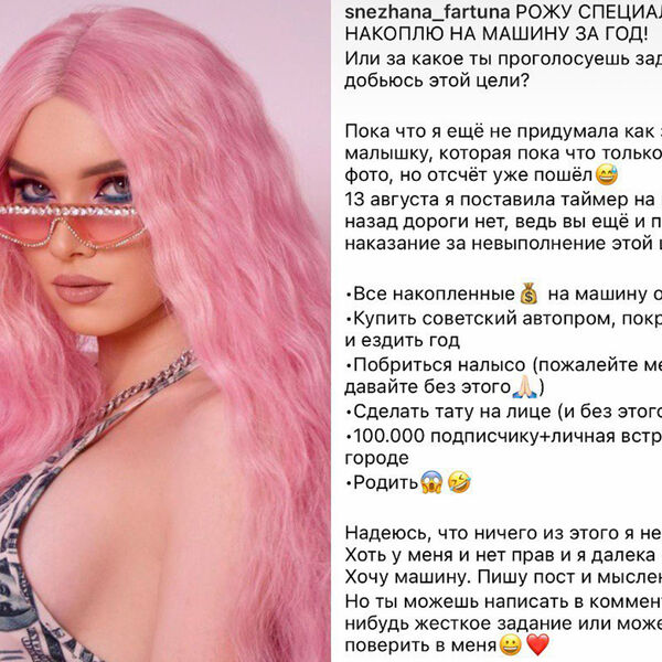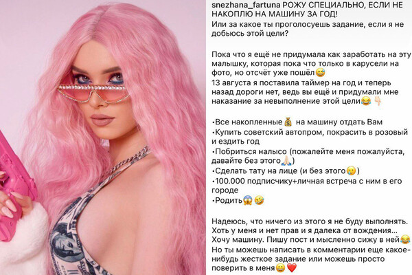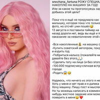 Блогер Снежана Сорокина (псевдоним – Фартуна), пообещавшая подписчикам в Instagram (владелец компания Meta признана в России экстремистской и запрещена) родить ребенка, если не накопит за год на машину, прокомментировала призыв депутата Госдумы Татьяны Ларионовой проверить ее публикацию. Девушка заявила «Газете.Ru», что заголовок ее поста был кликбейтным, и она этого не скрывала. Она также посоветовала «серьезным дядечкам и тетечкам» проще относиться к ее блогу.