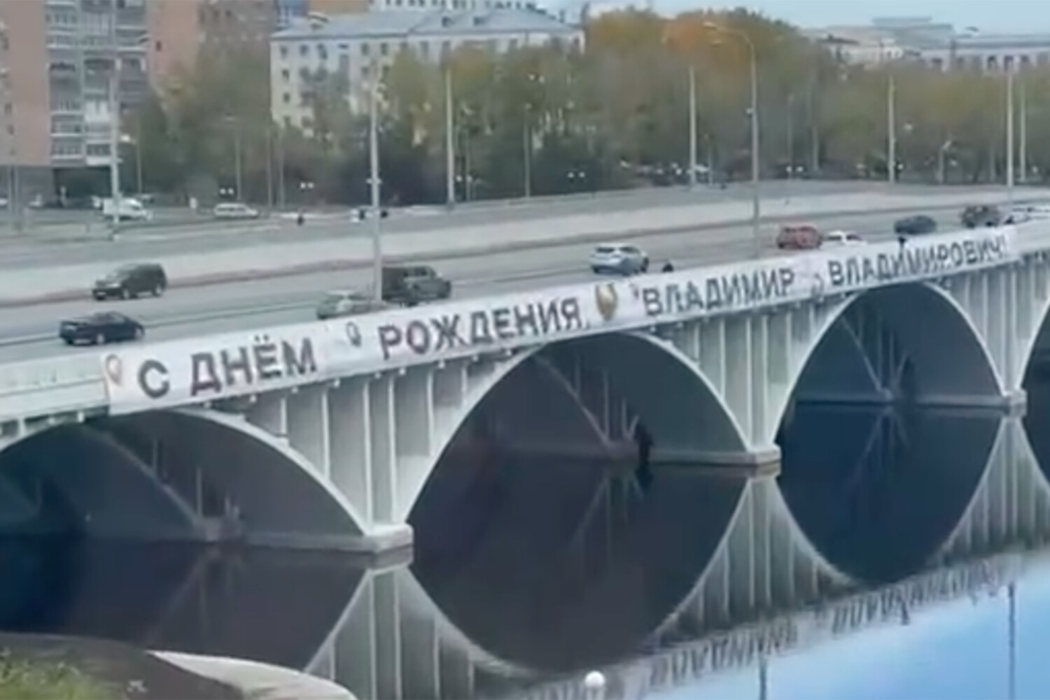 Поздравительная растяжка появилась на Макаровском мосту в Екатеринбурге в пятницу, 7 октября, однако исполнителей вскоре задержали правоохранительные органы. По информации регионального портала Е1, таким образом президента России Владимира Путина решили поздравить местные художники