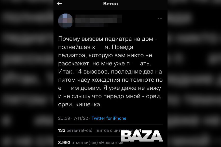 Ранее о том, что педиатра уволили из столичной поликлиники за пост в Twitter, сообщил Telegram-канал Baza. В своем посте врач написала, что вызовы врача на дом часто бывают бесполезны, так как у детей небольшие недомогания, а беспокойные родители раз за разом оставляют заявки на вызов врача. По ее мнению, из-за большого количества вызовов и одинаковых диагнозов внимание врача рассеивается.