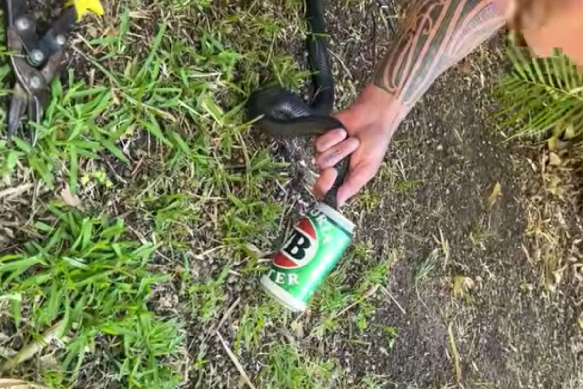 Спасателей вызвали местные жители, заметившие, что рептилия оказалась в затруднительном положении. Прибывшие на место специалисты обнаружили, что голова ядовитой краснобрюхой черной змеи застряла в банке популярной марки пива.
