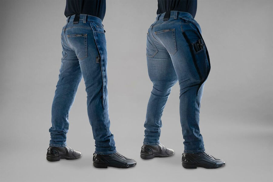 В компании рассказали, что штаны изготовлены из специальной ткани, которая ощущается как джинсовая. Материал отличается устойчивостью к истиранию и имеет водоотталкивающие свойства. Кроме того, в брюки встроены подушки безопасности, которые срабатывают во время ДТП для защиты нижней части тела мотоциклиста.