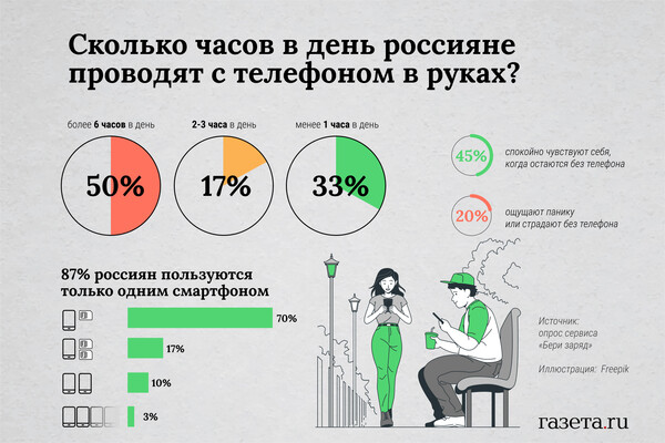 Более половины россиян испытывают дискомфорт, находясь без мобильного телефона. Такие данные получил сервис аренды пауэрбанков «Бери заряд» в результате опроса пользователей мобильных телефонов. «Газета.Ru» ознакомилась с выводами исследования.