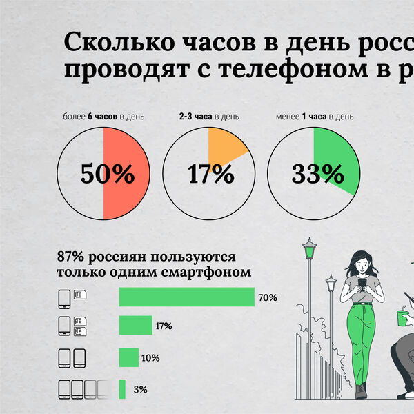 Также более 50% респондентов ответили, что проводят с телефоном в руках более 6 часов в день, а половина из них — постоянно. 17% опрошенных обходятся 2-3 часами в день, а 33% используют смартфон менее часа в день.
