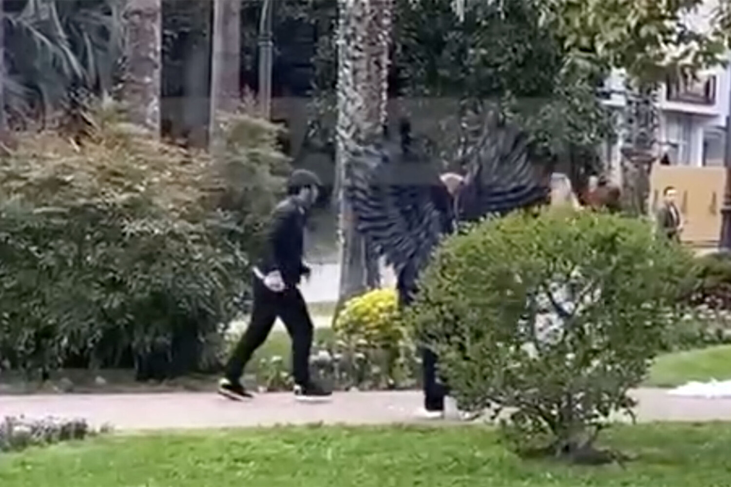 На записи от очевидцев события видно, что на территории пешеходной зоны дерутся трое мужчин. Двое из них одеты в монохромные костюмы ангелов, по крайней мере, у каждого из них сзади можно заметить массивные крылья из искусственных перьев. Они участвуют в потасовке с человеком в черной куртке, и дело доходит до драки, которую приходится разнимать другим прохожим.