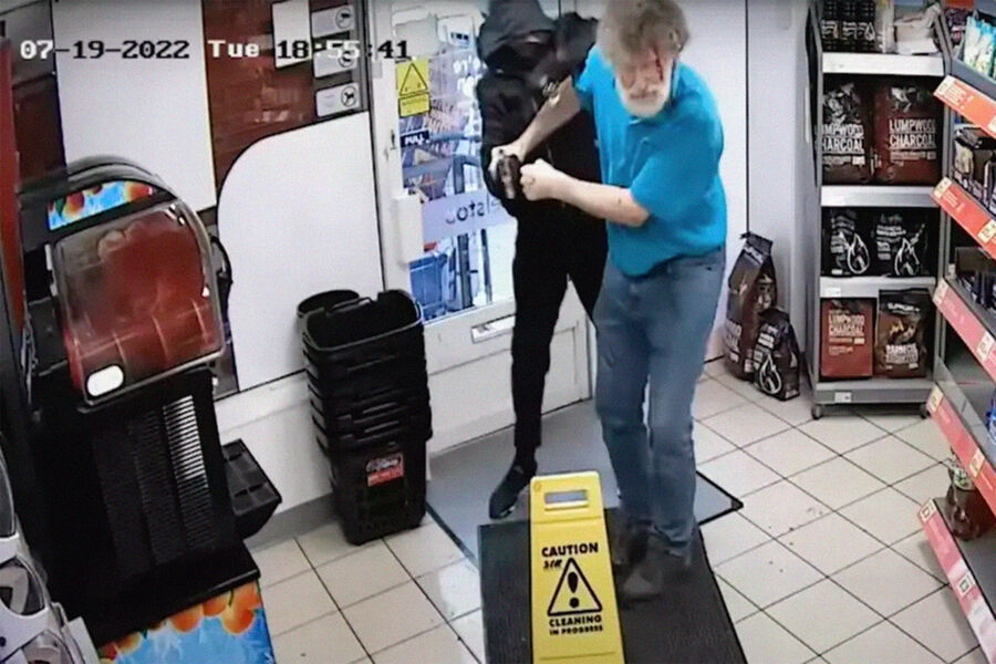 Cообщается, что нападавший ворвался в магазин, держа в руках пистолет, и начал угрожать 61-летнему Найлу Стрэниксу, который в этот момент был за прилавком, требуя отдать ему наличные из кассы. Не долго думая, продавец кинулся на грабителя и схватил его за шею.