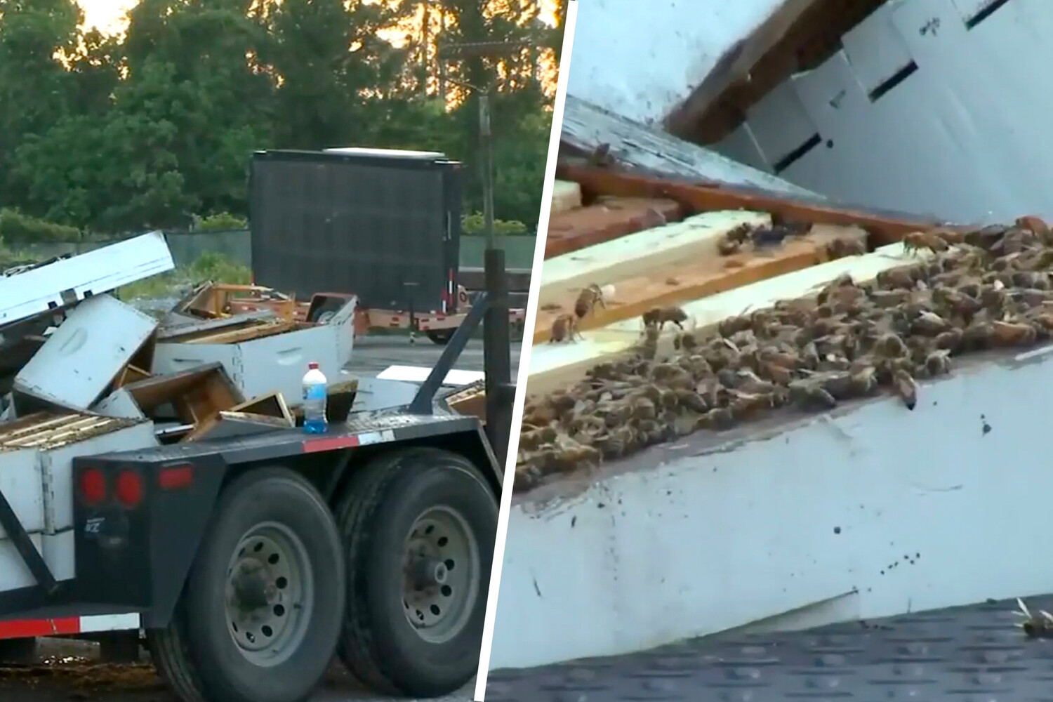 По данным полиции, тягач с прицепом, которым управлял 26-летний водитель, врезался в грузовик, перевозивший штабеля ульев, в которых жил миллион пчел. В результате ДТП шоссе заполонили тучи насекомых, но официальные лица заявили, что пчелы не проявляли агрессию к людям, поэтому никто не пострадал.