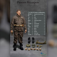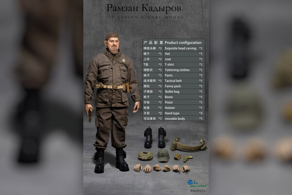 Игрушечный Кадыров выполнен в масштабе 1:6. К фигурке прилагаются ботинки, кепка, амуниция, а также три пары сменных рук.