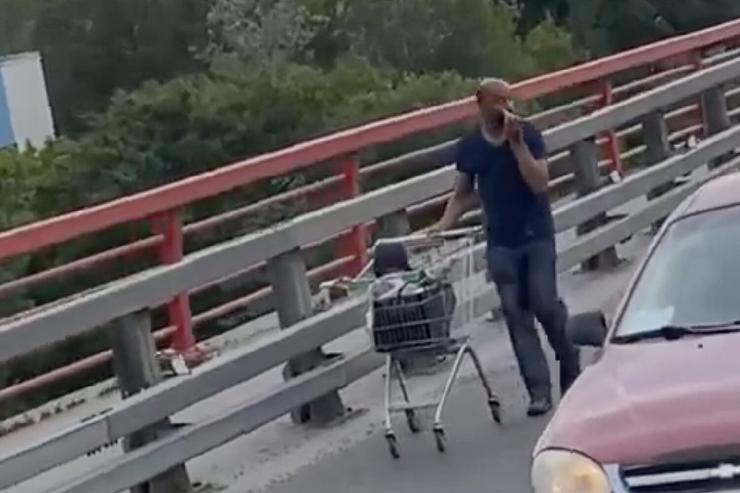 На кадрах мужчина везет маленького ребенка в тележке по мосту, рядом с ними — оживленное движение автомобилей. При этом мужчина не только не торопится, но и что-то ест на ходу. Запись сделана 12 июля на одном из мостов города.