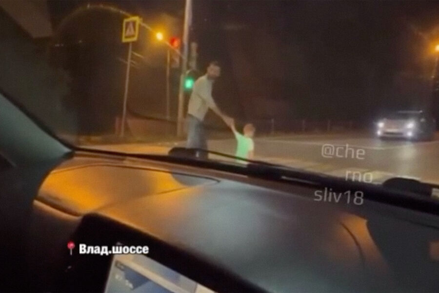 На кадрах пьяный мужчина ходит с малолетним ребенком, предположительно сыном, посреди Владивостокского шоссе. В какой-то момент мужчина оставляет мальчика одного и направляется к одной из машин, чтобы выяснить отношения с водителем. После этого он возвращается к ребенку и в сопровождении водителя авто уходит с дороги. Запись сделана вечером или ночью. Мужчина по неизвестной причине ходит по дороге в одних носках, на мальчике отсутствуют штаны, ребенок одет в футболку и носки.