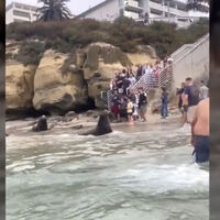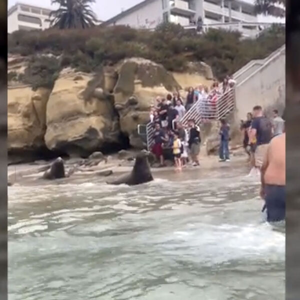 Инцидент произошел в городе Сан-Диего. Видео снял один из посетителей пляжа. На ролике заметно, как одно животное выбирается на сушу и двигается по направлению к отдыхающим. Спасатели, в свою очередь, предостерегают людей и призывают покинуть территорию.