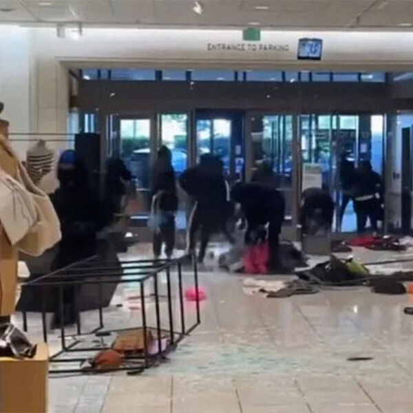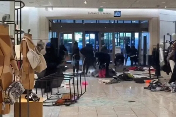 На кадрах инцидента видно, как группа людей, одетая в черную одежду и с масками на лицах, выбегает из магазина с полными руками товаров, включая спортивные сумки, кошельки и многое другое.