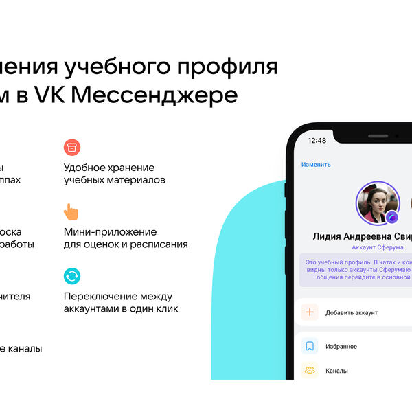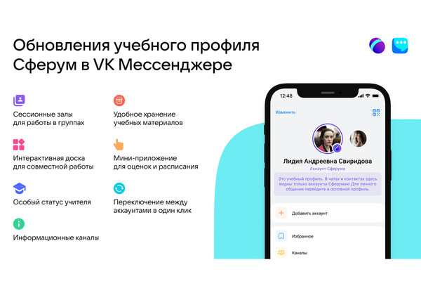 Упрощен процесс переключения между учебным и личным профилями в VK Мессенджере – теперь перейти из одного аккаунта в другой можно в один клик. Кроме того, в учебном профиле Сферум можно быстро начать общение с другим пользователем, пригласив его в чат при помощи QR-кода.