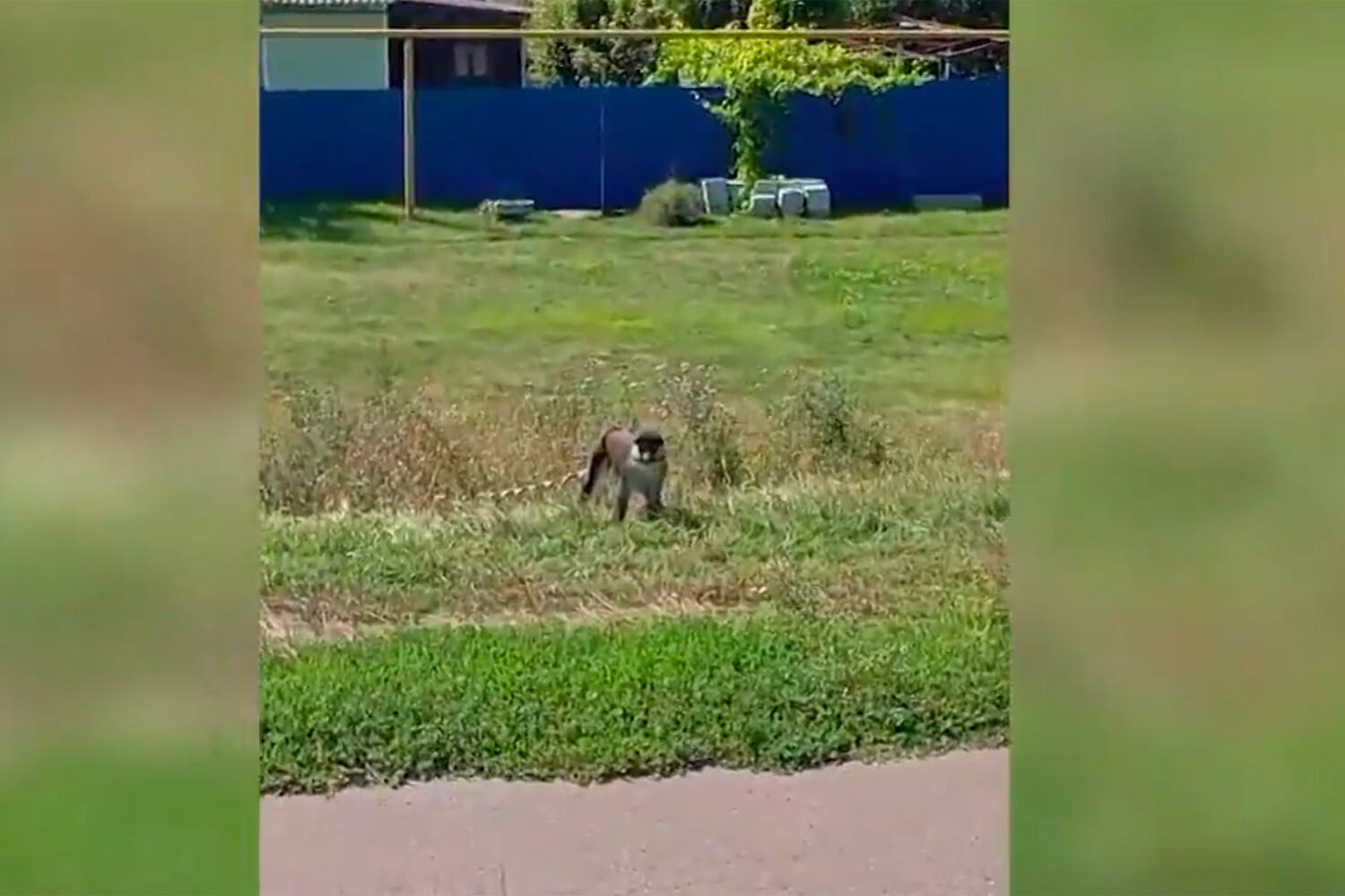 Животное засняли из салона машины в селе Травкино. Оно было привязано, подобно домашнему скоту, веревкой к деревянному колышку и гуляло неподалеку от частных домов. Кому принадлежит обезьяна и почему она оказалась на привязи, не уточняется.