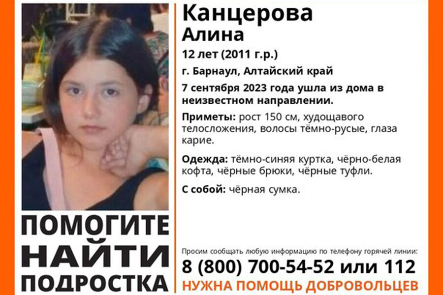 В Барнауле пропала 12-летняя девочка. 7 сентября ориентировку на нее составили в поисковом отряде »ЛизаАлерт».