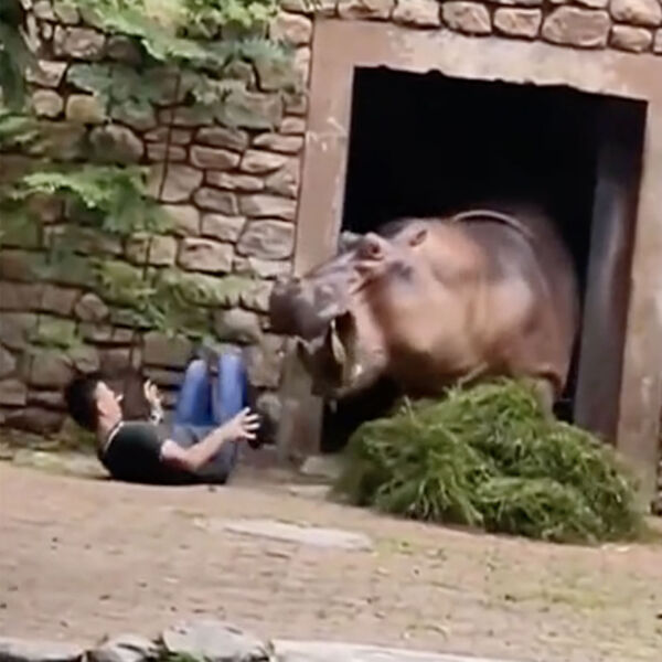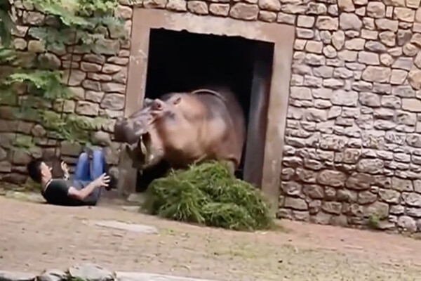 Смотрителю удалось выбежать из вольера и ускользнуть от огромной пасти гиппопотама, мужчине пришлось отбиваться от бегемота палкой и спасаться бегством.