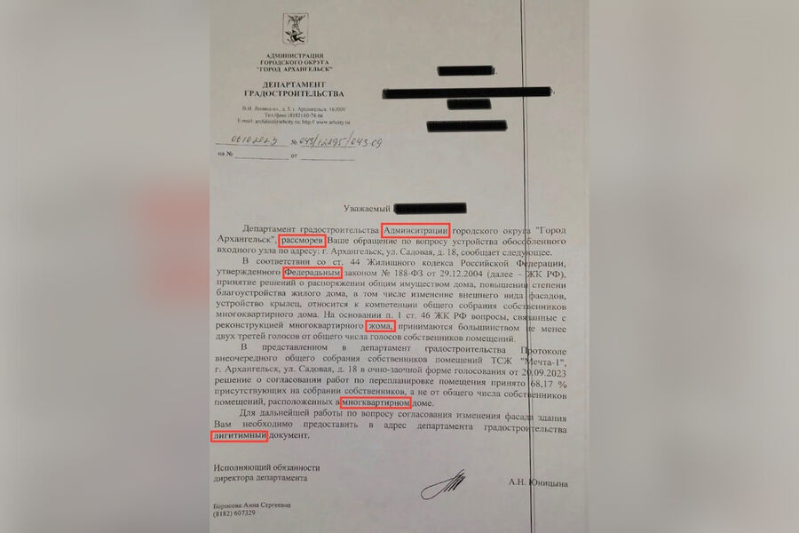 Житель Архангельска, отправивший запрос в департамент градостроительства, получил ответ от администрации города, в котором насчитал шесть ошибок. Фотографию ответа опубликовал Telegram-канал «Подъем».