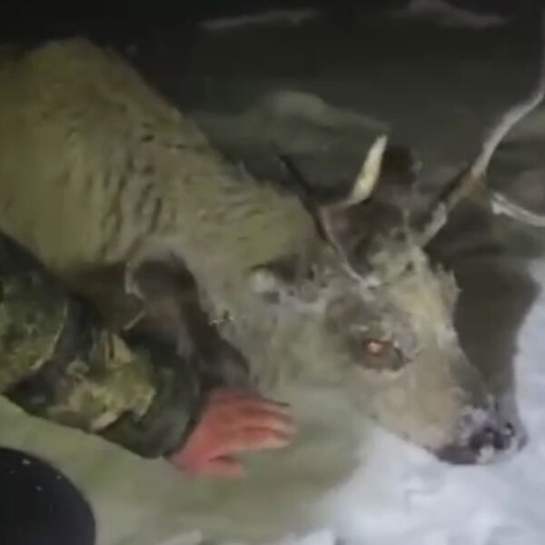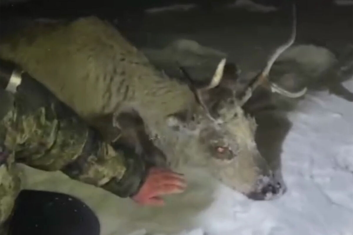 Как отметили инспекторы, оленю около четырех лет, лежать на льду ему долго не дали — животное могло замерзнуть, зверя заставили бежать, чтобы он быстрее согрелся.