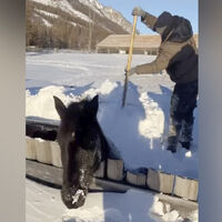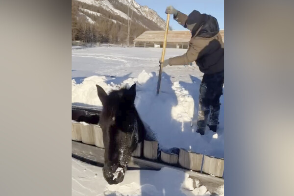 Спасение животного сняли на видео местные жители, конь провалился в огромный сугроб в местности Шара Окинского района Бурятии. Лошадь, снегом прижатую к забору, заметили мужчины, на поверхности виднелась лишь ее голова.