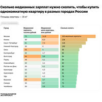 Цены на квартиры рассчитывались на основе одной из самых популярных площадок объявлений, рассматривали однокомнатные квартиры площадью от 30 до 40 м². В одних городах вышло больше жилья на первичном рынке, в других — на вторичном. Поэтому отдельно считали медианное значение по обоим типам жилья и брали среднее между ними. За счет этого результат получился примерно такой, как если бы доля первички и вторички везде была одинаковой. Средние зарплаты считали по данным одного из самых популярных агрегаторов вакансий. При этом предполагается, что в условной семье, где двое работающих, зарплату одного партнера откладывают на покупку будущей квартиры, а на жизнь, оплату ЖКУ и все остальное идут доходы второго.