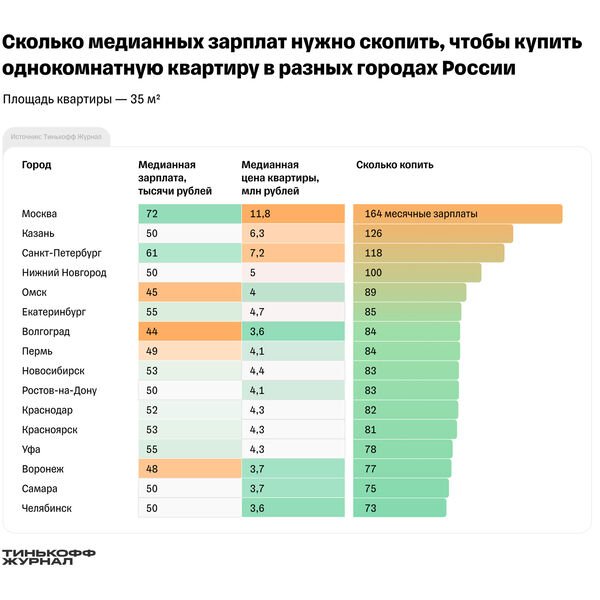 Что касается отдельных городов, ожидаемо самая недоступная однушка в Москве. Здесь она стоит 164 месячные зарплаты, или почти 14 лет непрерывной работы (при условии, что откладывается полная зарплата). Медианная зарплата в Москве — 70 тысяч рублей. При этом однокомнатная квартира в столице стоит почти втрое дороже, чем в среднем по стране, — 11,8 млн рублей.