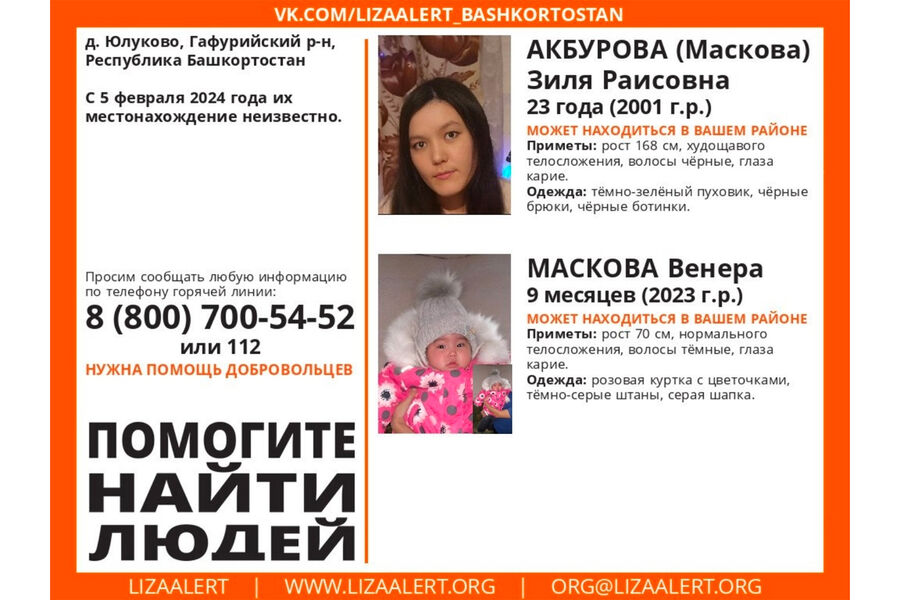 Женщина ушла из дома в деревне Юлуково 5 февраля, с собой она забрала девятимесячную дочь. Деревня, в которой проживает женщина, находится в 130 км от Уфы, в ней проживают около 700 человек.