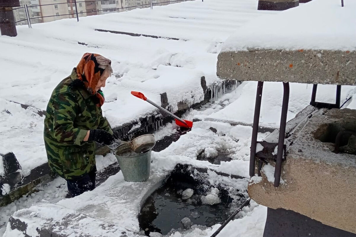 В Миассе 76-летняя женщина чистит крышу девятиэтажки, чтобы ее не затопило