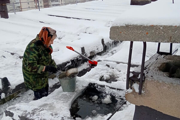 Женщина проживает в девятиэтажном доме по улице Октября. Чтобы избежать затопления квартиры из-за таяния снега на крыше, пенсионерка сама выходит работать лопатой. По словам женщины, коммунальные службы на ее просьбы убрать снег не реагируют.