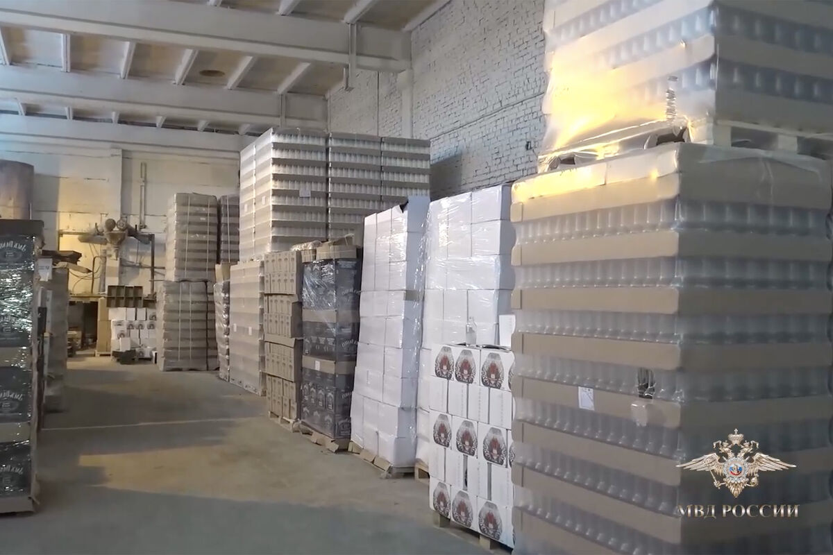 Сообщается, что нелегальный цех сотрудники правоохранительных органов обнаружили в селе Борино. Во время обыска из двухэтажного ангара изъяли около 20 тысяч бутылок с немаркированным алкоголем и специальное оборудование.
