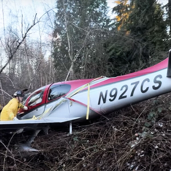На кадрах самолет Cirrus SR-22 падает носом вперед и приземляется на деревья без серьезных повреждений. Известно, что судно было оснащено парашютной системой CAPS, которая успешно раскрылась.