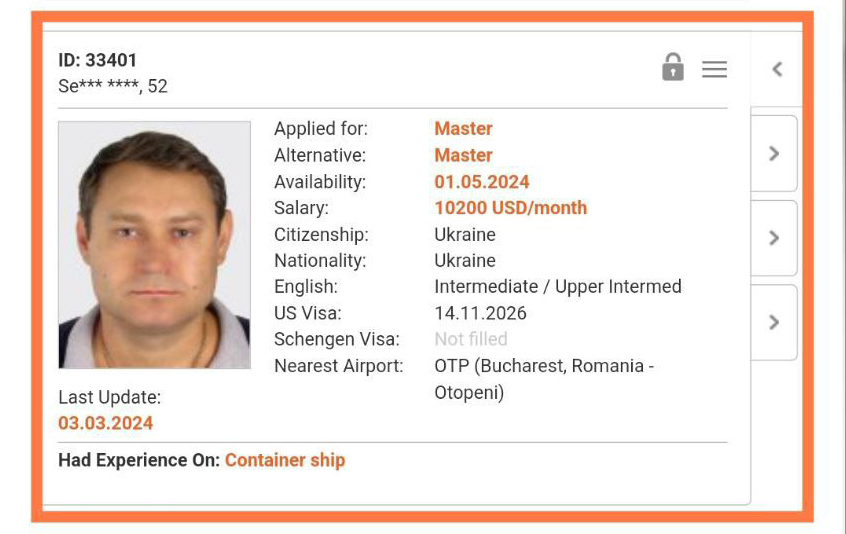 «Последний известный контракт: капитан, контейнеровоз, подписание 19 февраля 2024 года», — указано в документах мужчины.