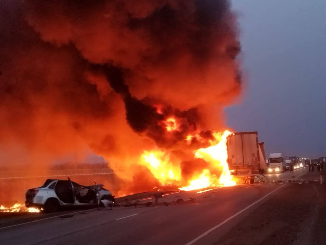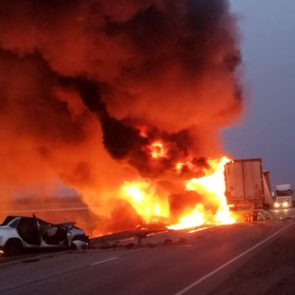 На кадрах с места инцидента заметно, что огонь охватил часть грузовика. Легковой автомобиль после столкновения смяло. О количестве пострадавших не сообщается.