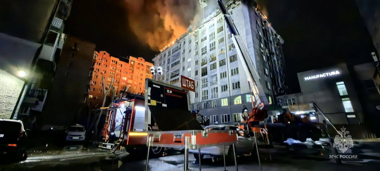 Огонь распространился на площади 900 квадратных метров. 40 человек самостоятельно эвакуировались из здания. В тушении пожара участвуют 120 сотрудников МЧС и 32 единицы техники. По предварительным данным, пострадавших нет.
