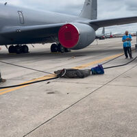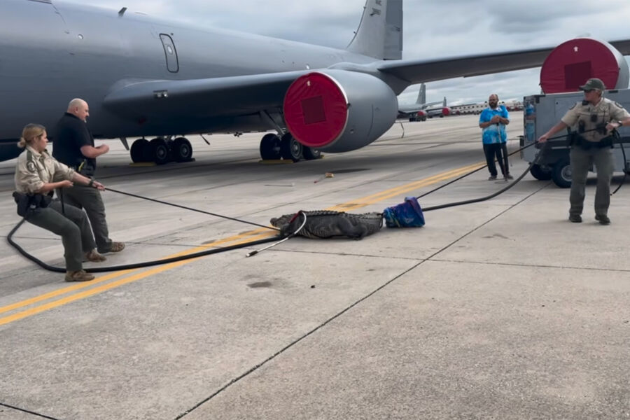 Инцидент произошел на военной базе ВВС в округе Хиллсборо. Трехметрового аллигатора заметили на взлетно-посадочной полосе аэродрома. Рептилия ползала между военными самолетами и улеглась спать под одним из них, агрессии к людям хищник не проявлял.