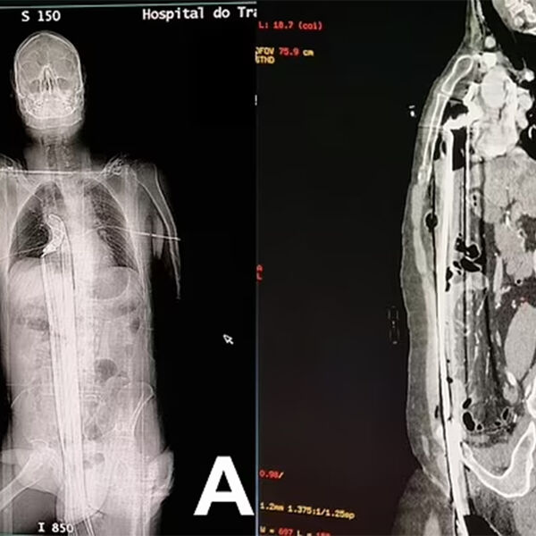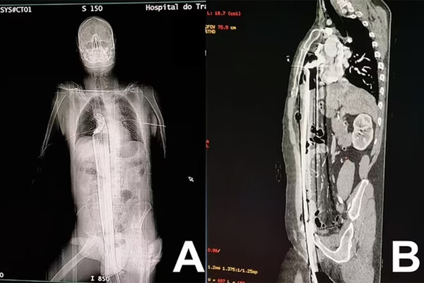 Инцидент произошел на стройплощадке в городе Куритиба: 57-летний рабочий находился на строительных лесах, когда поскользнулся и полетел вниз. Падение пришлось на торчавший металлический штырь, который пронзил мужчину вдоль: штырь вошел через пах, поразил печень и достиг верхней части диафрагмы, едва не задев сердце.
