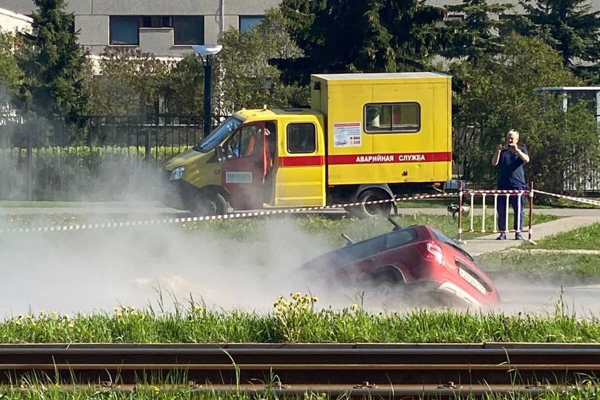 Опубликовано видео, как машина провалилась в яму с кипятком в Купчино