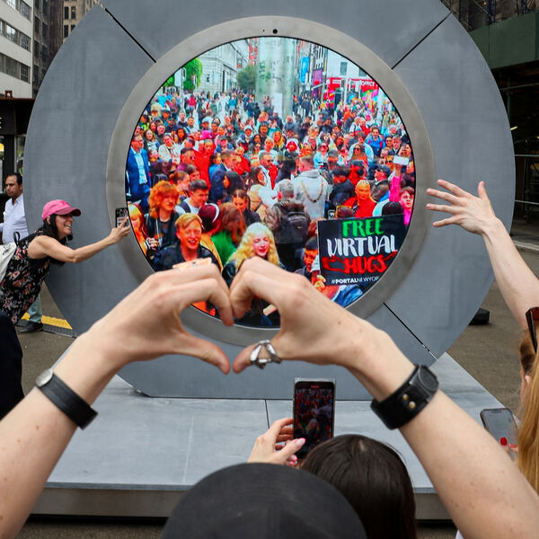 «Видеопортал», представляющий собой два экрана, похожих на линзы, с круглосуточной видеосвязью, но без звука, открылся 8 мая в Дублине на центральной улице О'Коннелл-стрит и на Пятой авеню в Нью-Йорке. По задумке создателя скульптур, литовского художника Бенедиктаса Гилиса, жители городов должны были общаться между собой в режиме реального времени.