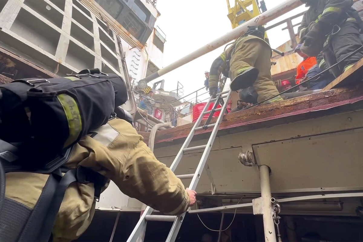 В ведомстве рассказали, что из помещения рефрижераторных установок судна идет густой дым. До приезда пожарных расчетов его экипаж эвакуировался.