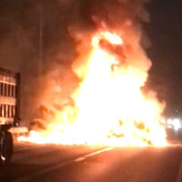 Инцидент произошел на Московском шоссе. На кадрах сообщества «ДТП и ЧП | Санкт-Петербург» заметно, как практически по всей ширине дороги распространился огонь.