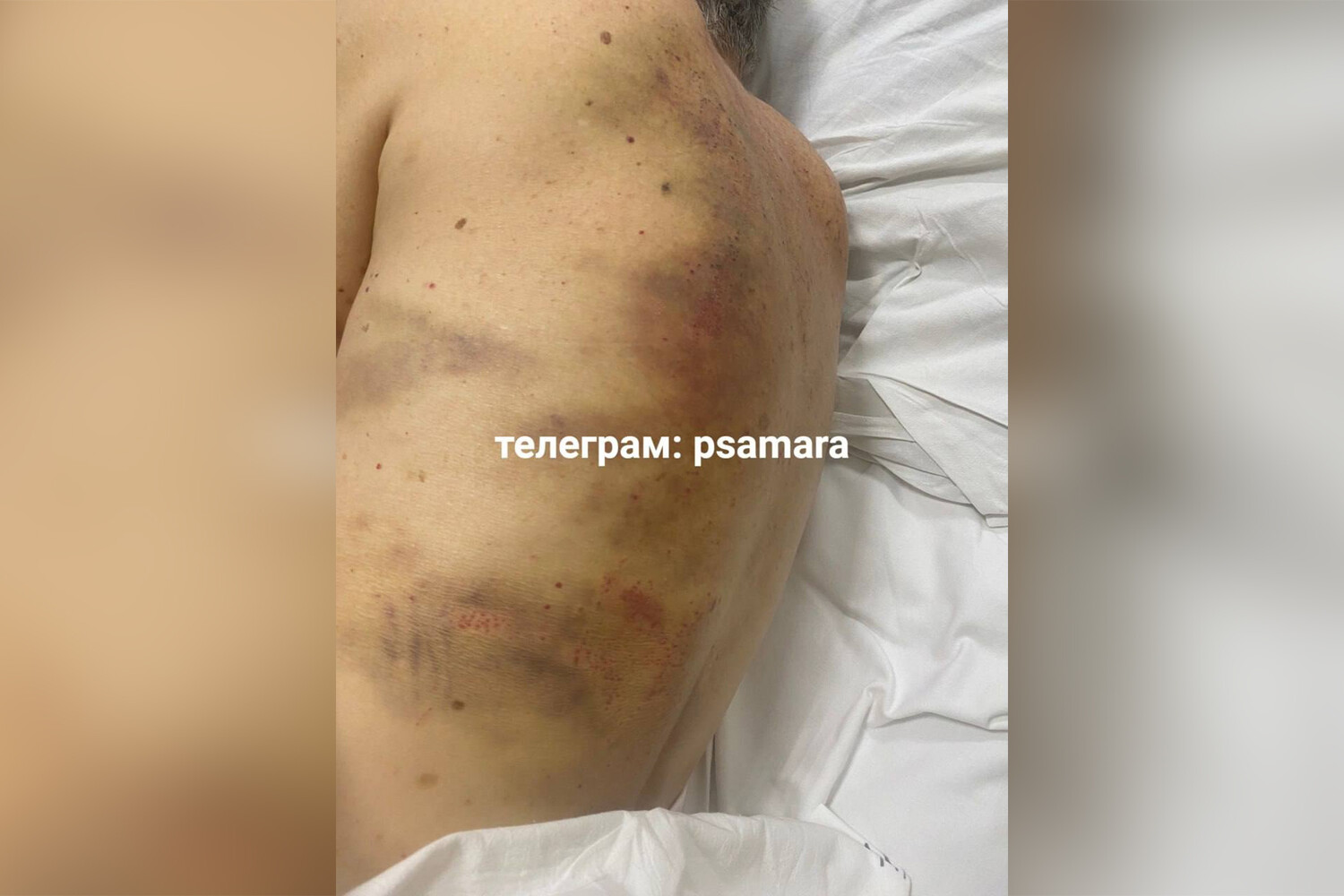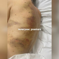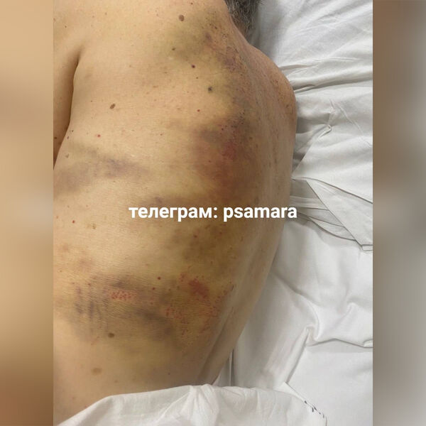 На фото спины пострадавшего заметны многочисленные синяки и кровоподтеки. Большая часть из них расположена вдоль позвоночника, большие пятна заметны и на ребрах. Информация о других травмах не уточняется.