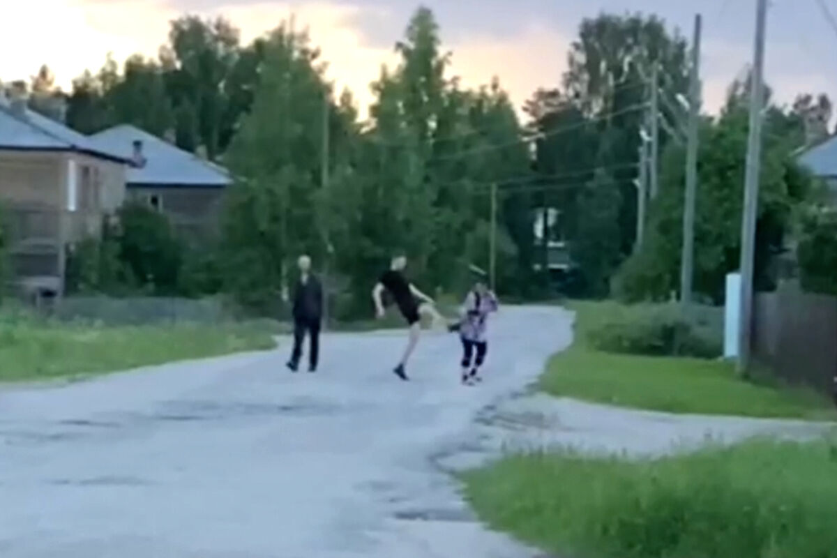 Инцидент произошел в Муезерском. На кадрах заметно, как двое молодых людей идут по дороге рядом с пенсионеркой, но в какой-то момент она начинает убегать от них. Один из юношей следует за женщиной, после чего ударяет ногой в спину.