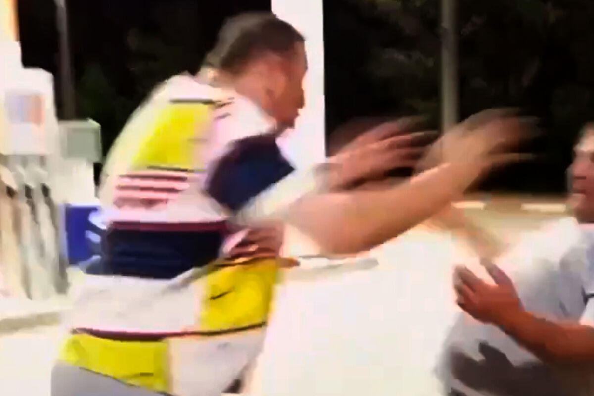 Позже на заправке между водителем и супругом женщины произошел словесный конфликт. На кадрах с места инцидента видно, как водитель толкает мужчину, который в результате падает на землю. При этом все участники конфликта нецензурно общаются на повышенных тонах.